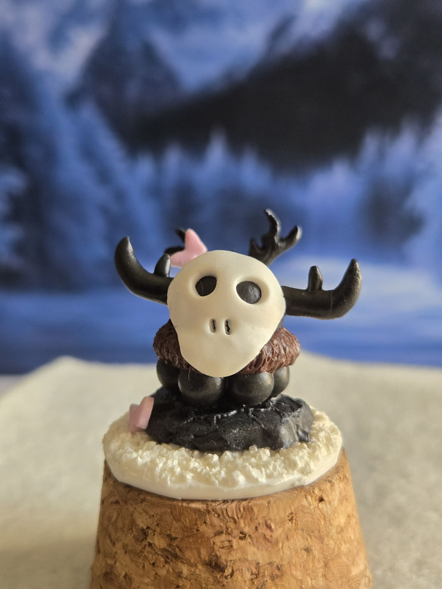 C’est sur ce rocher que se dresse le mini wendigo, immobile, presque gardien de ce territoire gelé. En arrière-plan, un arbre noir, sans feuilles, mort depuis longtemps, accentue l’atmosphère froide et mystérieuse de la scène.
