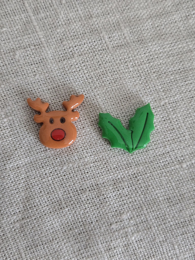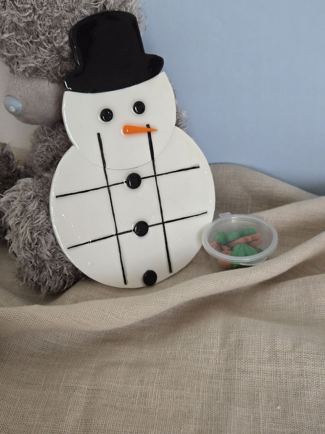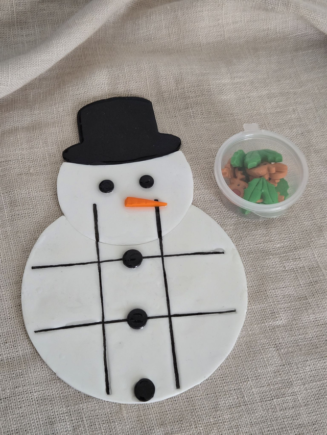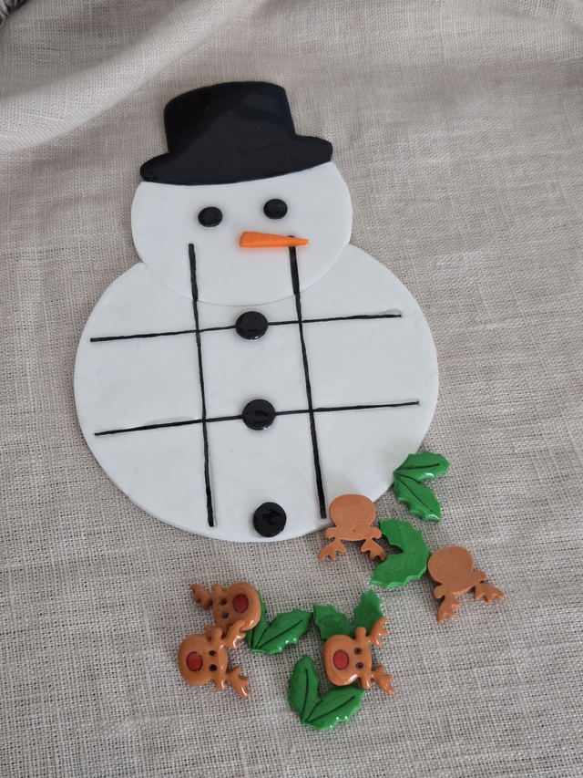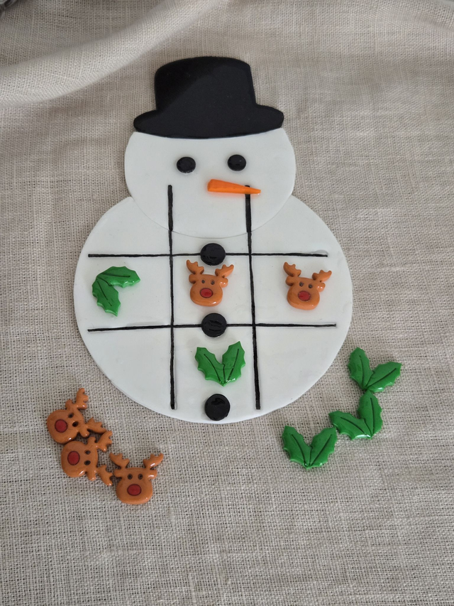 Plateau de morpion en forme de bonhomme de neige, accompagné de ces 10 pions : 5 feuilles de houx et 5 cerfs de noël